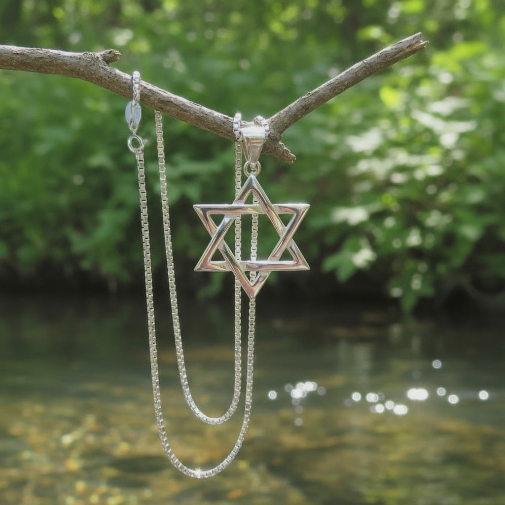 Symbolism: The six-pointed star, known as the Magen David or Shield of David, represents divine unity and spiritual strength. In sacred geometry, the Merkaba—its three-dimensional form—symbolizes the light body and the connection between higher realms and the physical plane.